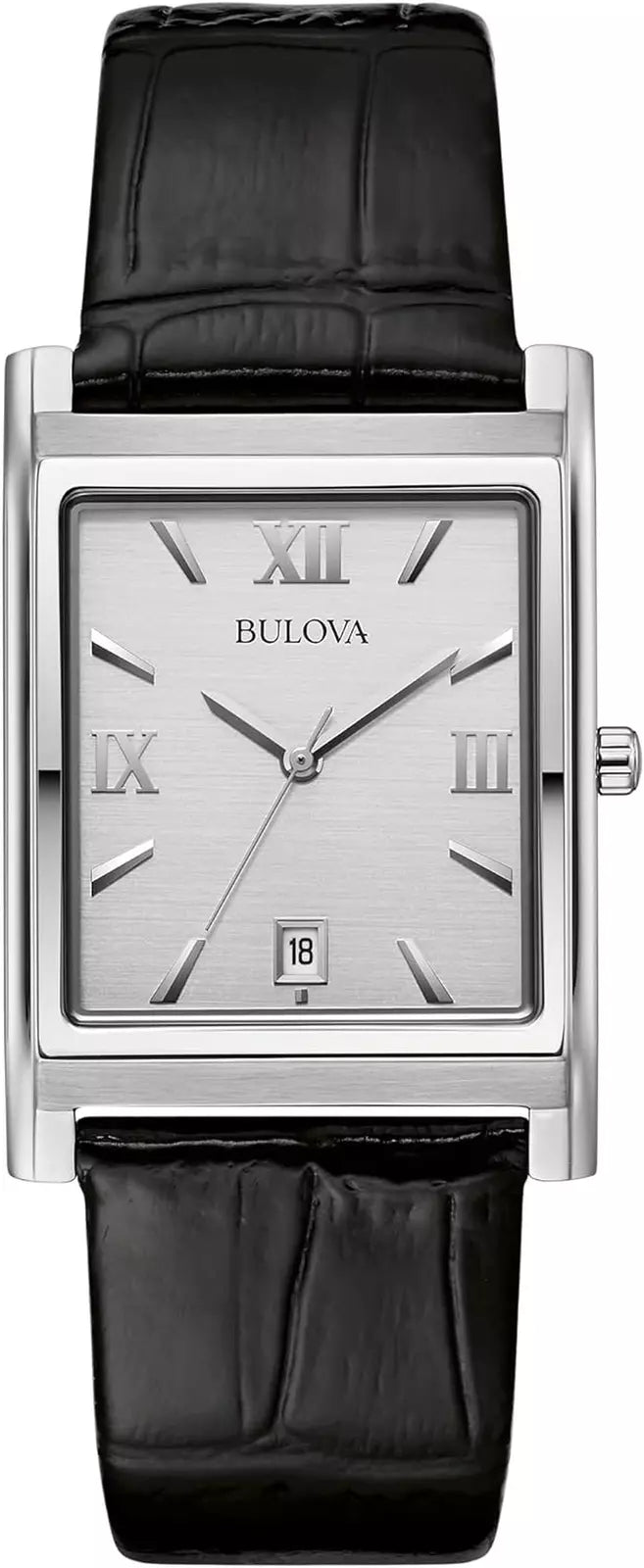 El reloj rectangular Sutton para hombre es el nuevo paradigma de la elegancia clásica. Fabricado con un elegante diseño geométrico con acabado cepillado y pulido, la delgada caja de acero inoxidable en tono plateado está engastada con un cristal de zafiro y presenta ángulos y líneas cuidadosamente incorporados para una presencia impactante en la muñeca. El patrón de tachuelas de la esfera blanca texturizada proporciona un aspecto icónico, mientras que los marcadores de bastón y números romanos en tono oro rosa alternados transmiten una calidad atemporal. La esfera también está equipada con una pantalla de fecha a las 6 en punto y agujas pulidas en tono plateado El reloj está cuidadosamente combinado con una correa de cuero negro en relieve a juego equipada con un cierre de hebilla. Realce su estilo con el elegante y delgado reloj rectangular Bulova Sutton.